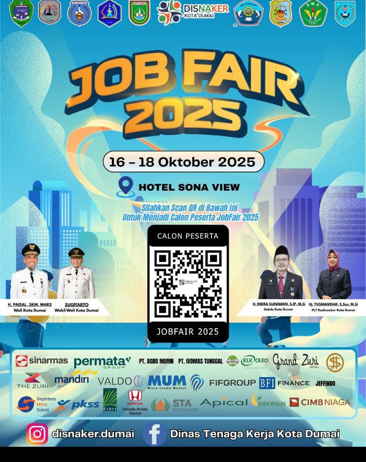 Diakuinya bagi para pencari kerja yang berminat untuk mengikuti Job Fair, bisa segera melakukan pendaftaran yang telah dibuka dari 12 Oktober 2025 melalui Scan QR pada akun Ig disnaker.kotadumai.