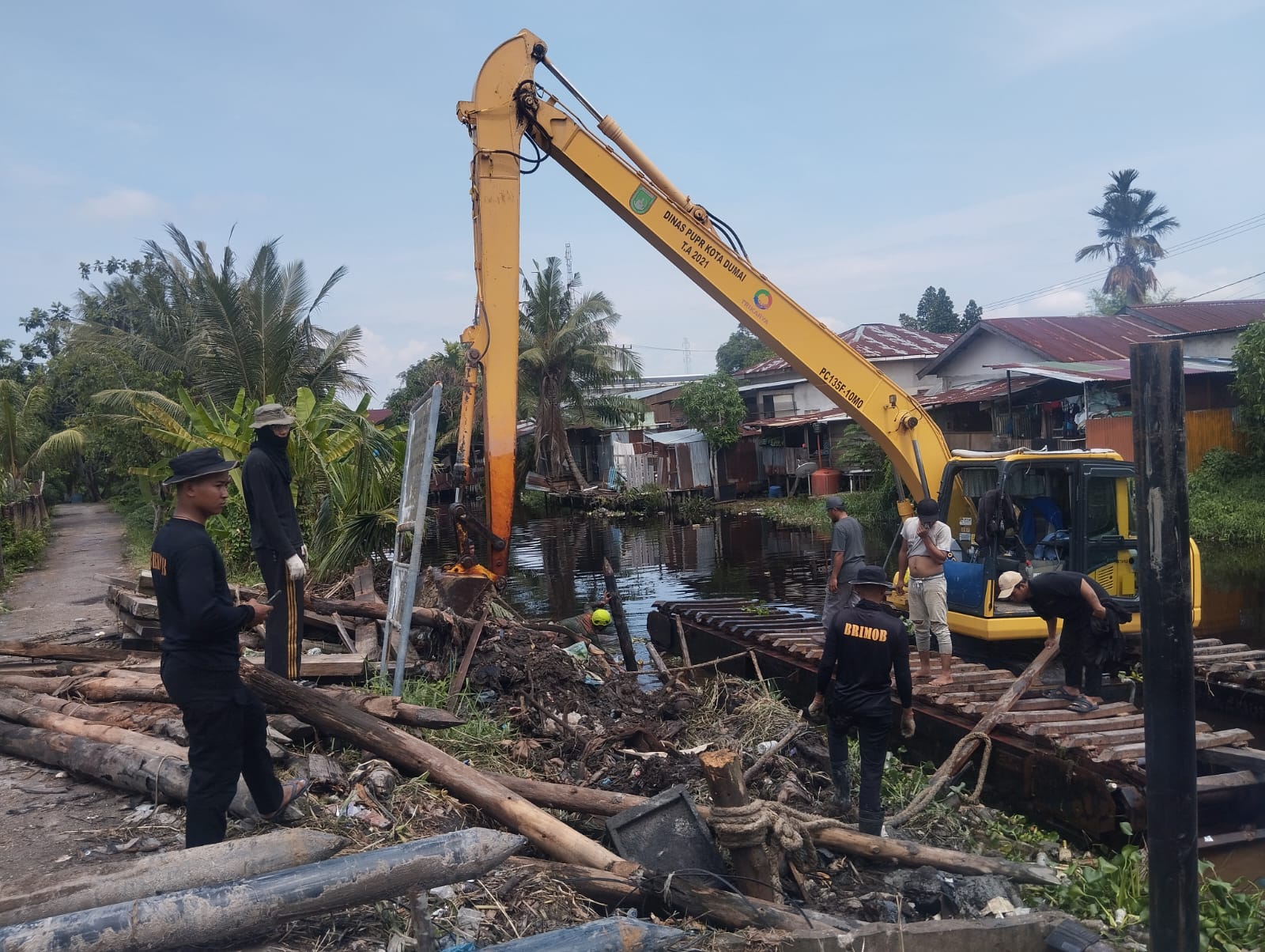 Progres pembangunan serentak jembatan berlokasi di Jalan Perintis Kelurahan Bumi Ayu yang melibatkan kolaborasi antara 3 personel Polres Dumai, 5 personel BKO Sat Brimob, dan dibantu oleh 4 orang relawan setempat.