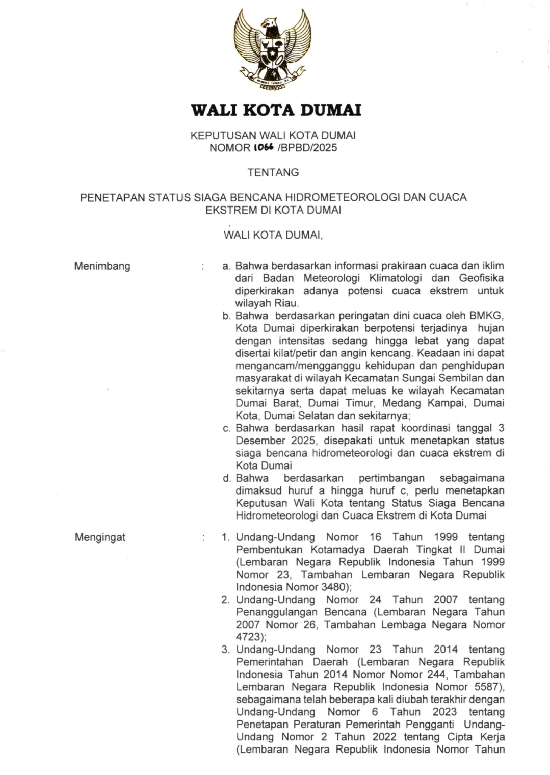 RZNEWS – Walikota Dumai Haji Paisal menetapkan Status Siaga Bencana Alam dan Cuaca Ekstrem selama 60 hari terhitung sejak 5 Desember 2025 hingga 5 Februari 2026 mengingat curah hujan sedang dan lebat disertai angin kencang.
